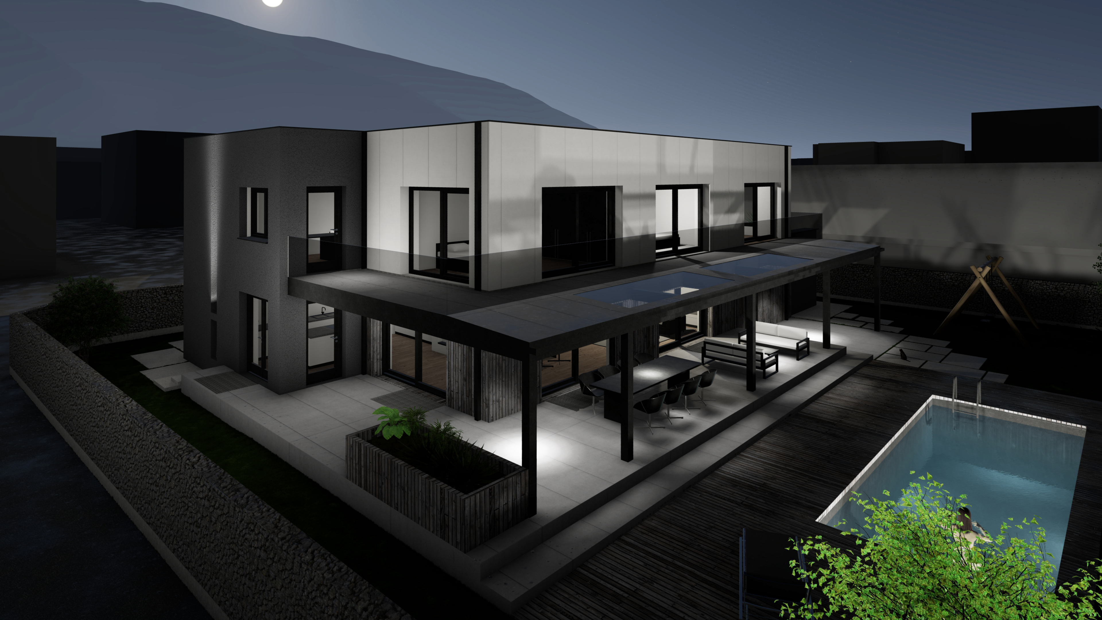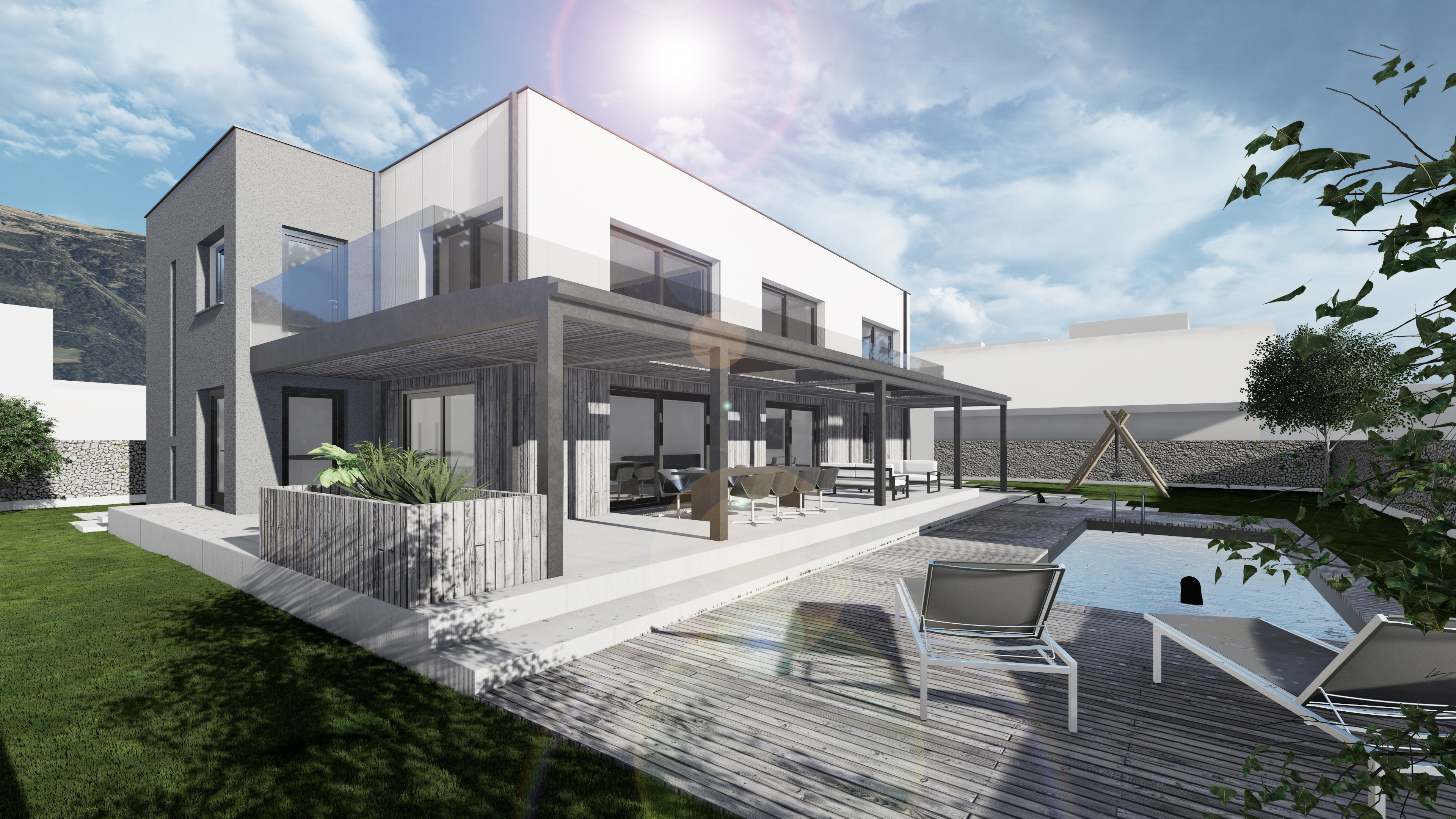 An dem Bestandsgebäude wurden der Dachstuhl sowie das zweite Obergeschoss abgetragen und durch ein Flachdach mit Attika ersetzt. Die bestehende Garage wird ebenfalls entfernt und durch einen Neubau an der Ostseite des Gebäudes ersetzt – über diesem, erhält das erste Obergeschoss eine Wohnraumerweiterung. Die südseitige Terrasse und der nordseitige Zugangsbereich werden überdacht und mit einem Swimmingpool ergänzt. Der bestehende Baukörper wird mit einem Vollwärmeschutz und einer neuen Fassadeverkleidung saniert.