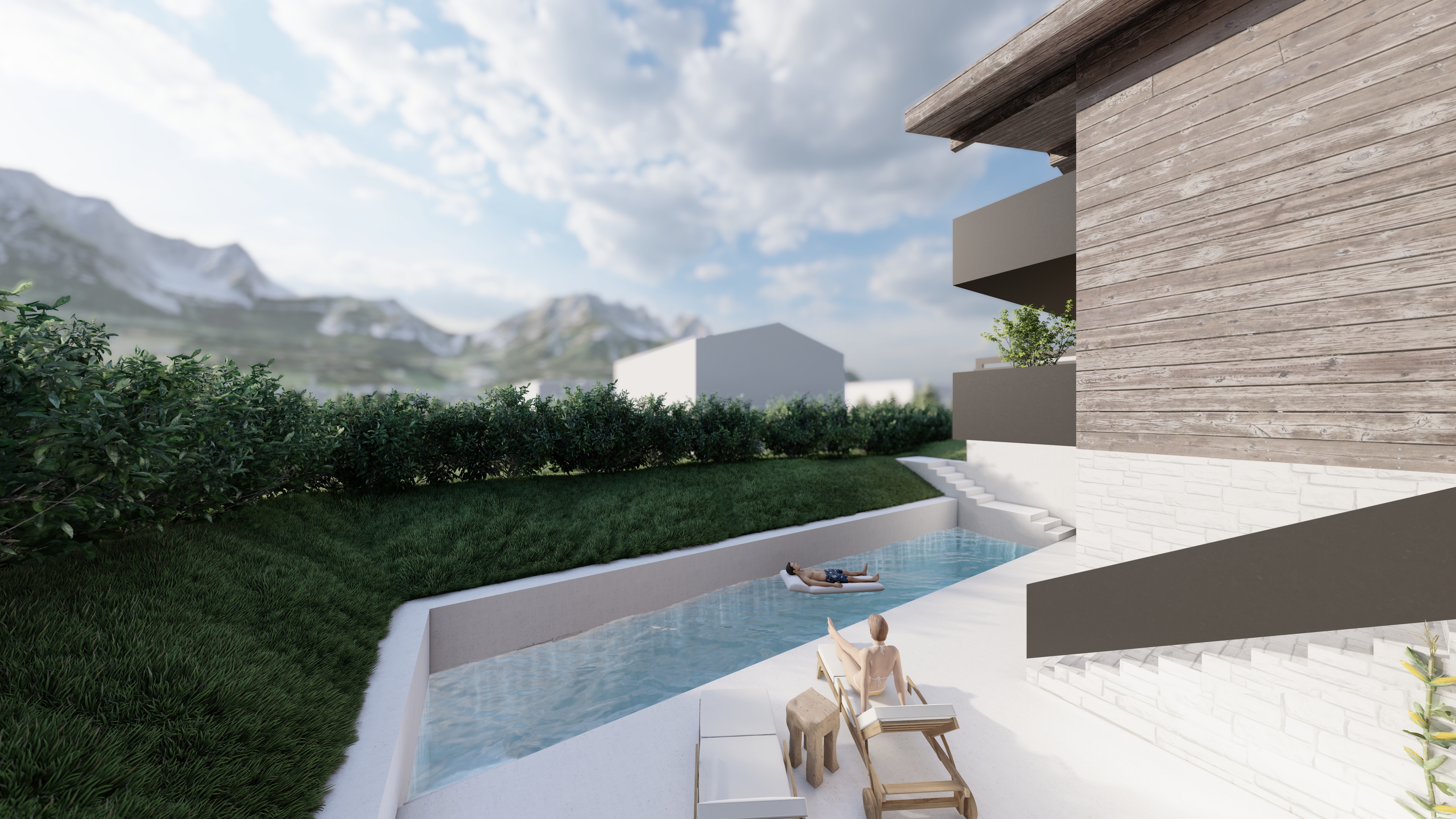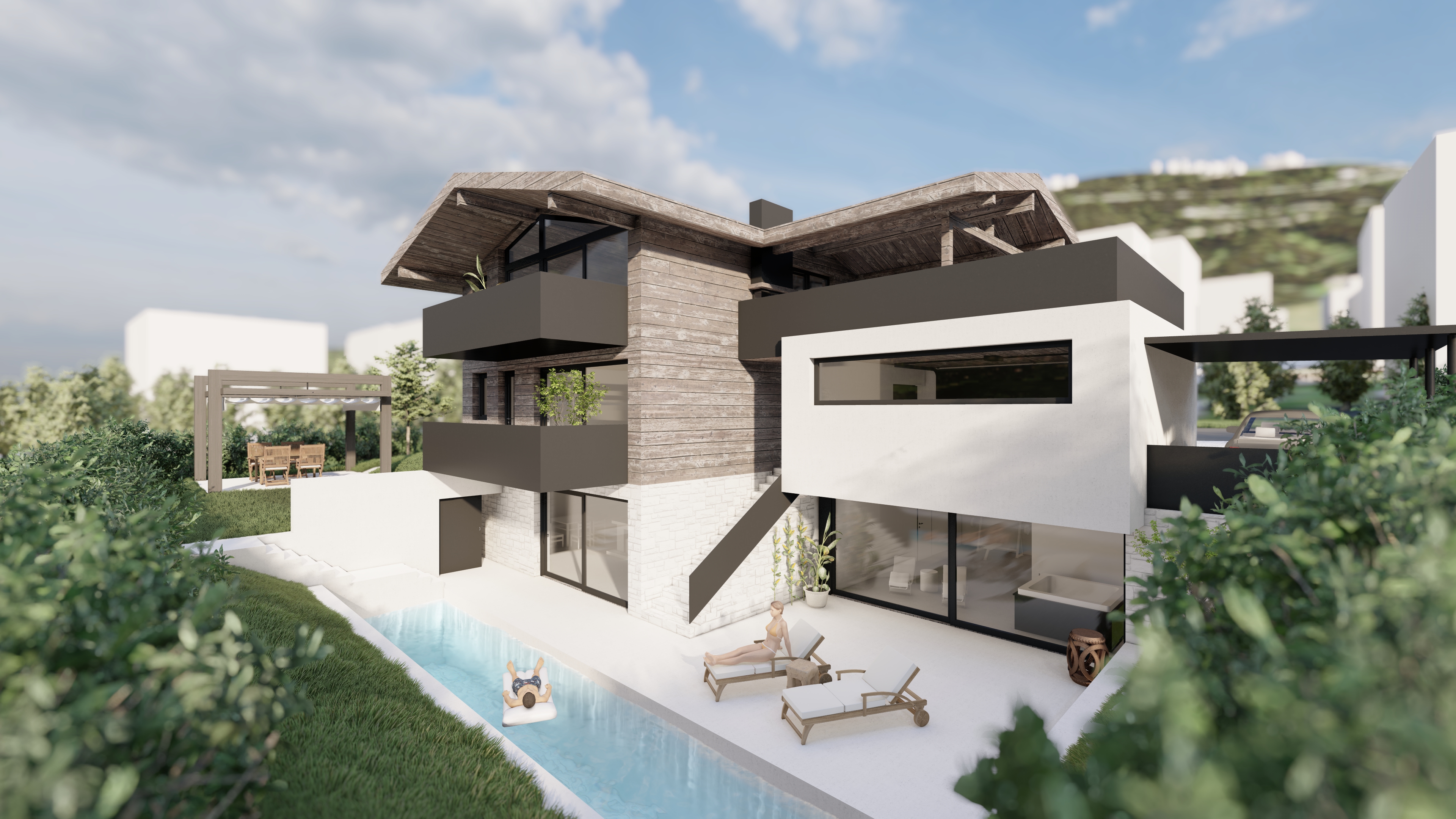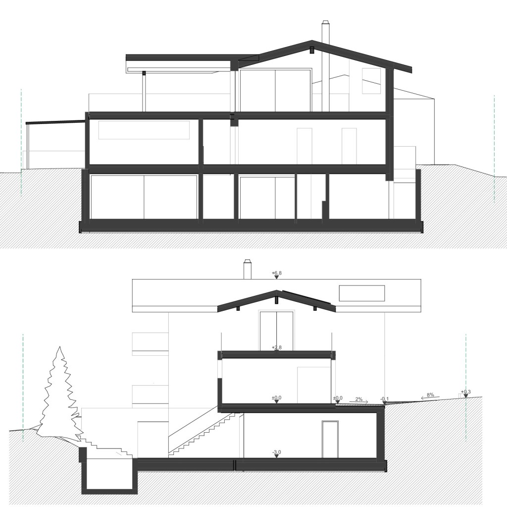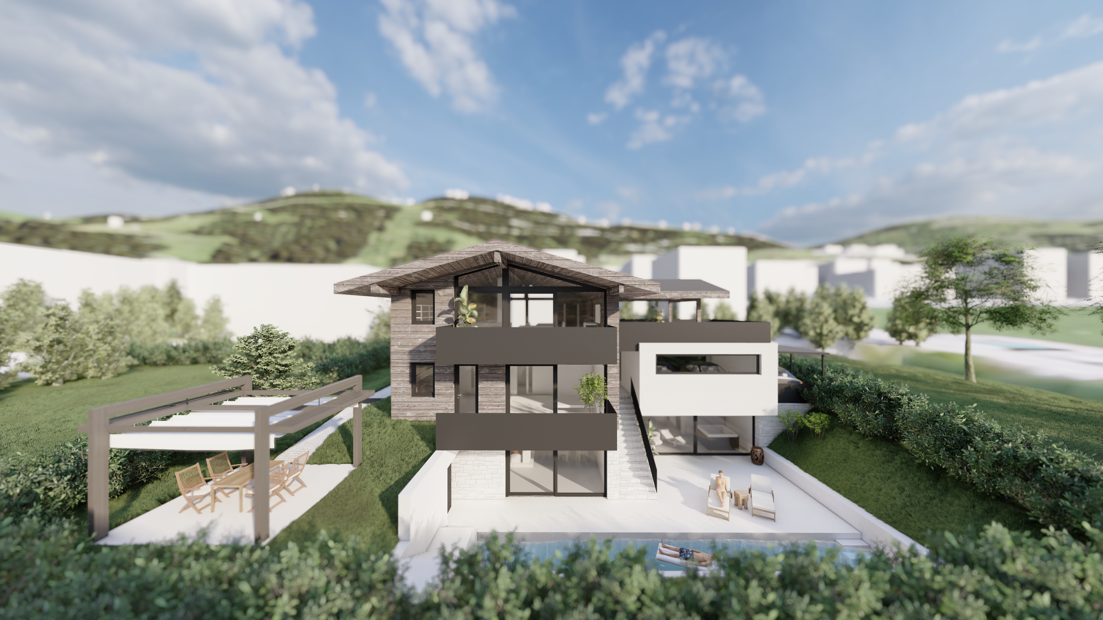 In leichter Hanglage entsteht in Going ein Wohnhaus mit perfektem Blick auf das Kaisergebirge. Zwischen der Garage und dem Gebäude befindet sich der Überdachte Zugang. Während das Erdgeschoss dem Masterbereich vorbehalten ist, befindet sich im Obergeschoss der großzügige Wohn-, Koch, & Essbereich. Eine über der Garage befindliche, große Terrasse ermöglicht viele Nutzungen mit Ausblick Richtung Norden, Westen & Süden. Im Untergeschoss befindet sich neben dem Gästezimmer und einem Büro auch noch ein Wellness- & Spa-Bereich. Die Terrasse ist Nordseitig situiert und zum Gebirgspanorama ausgerichtet.