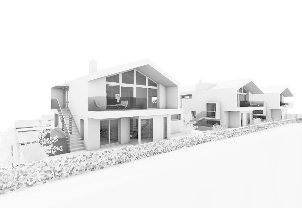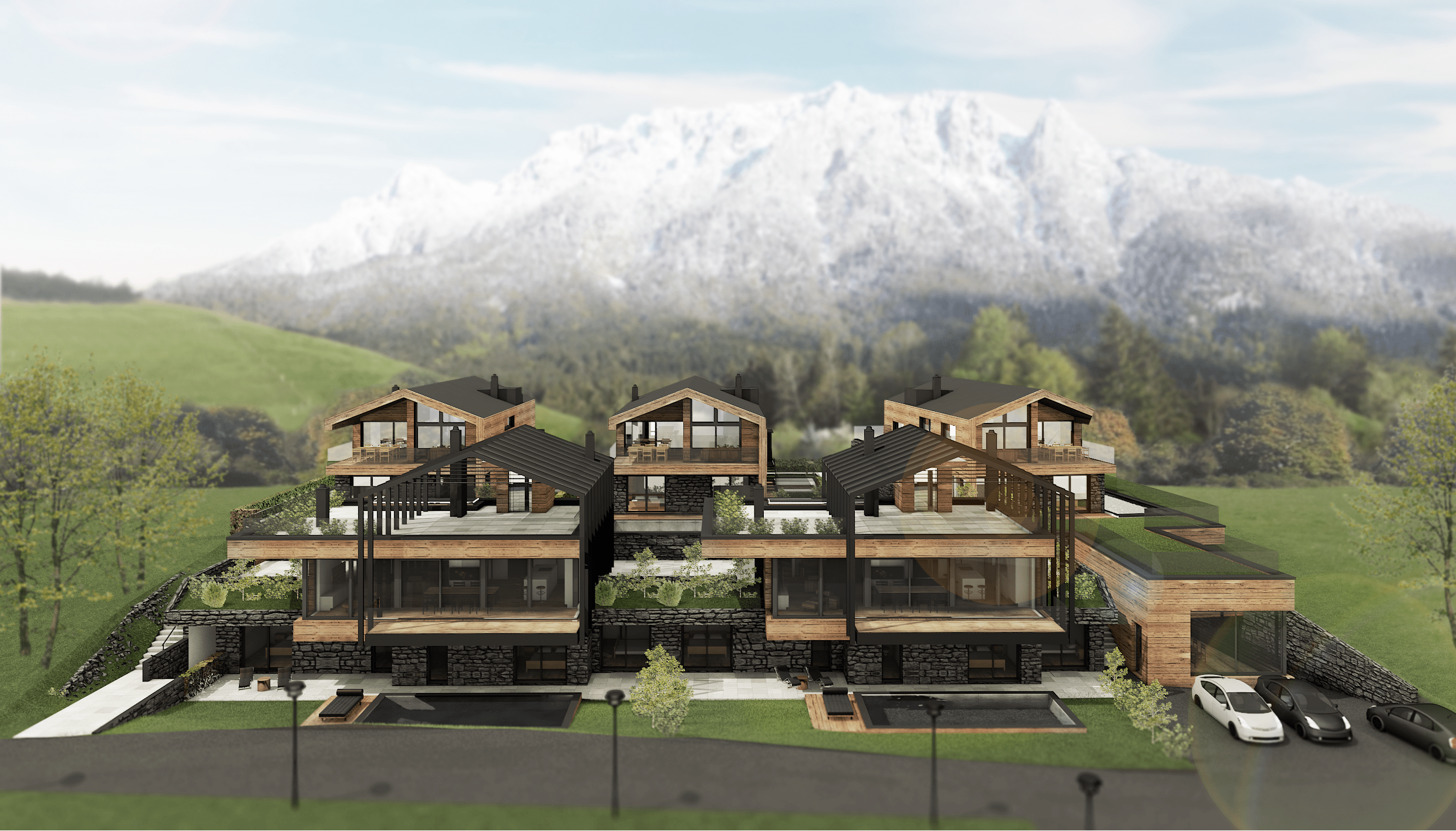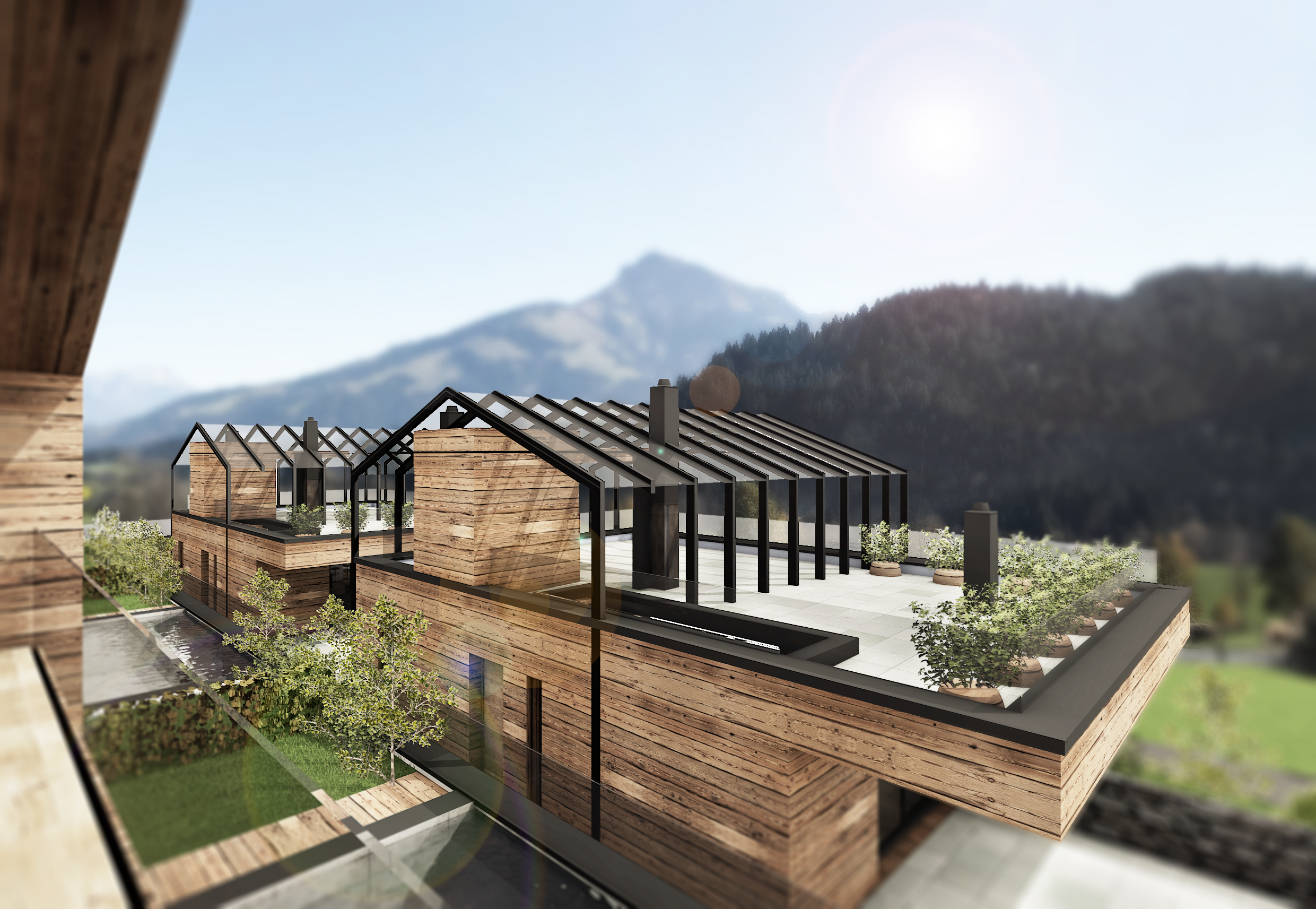 Auf dem Südhang entsteht ein Ensemble aus fünf hochwertigen Wohnhäusern mit traumhaften Ausblick auf das Kaiser Gebirge sowie das Kitzbüheler Horn. Jedes der Einheiten besitzt neben drei Schlafzimmern einen eigenen Wellnessbereich sowie einen Aussenpool. Eine gemeinsame Tiefgarage bietet Platz für drei Fahrzeuge pro Einheit. Des Weiteren existiert ein Multifunktionsraum zur gemeinschaftlichen Verwendung. Während die drei nördlichen Gebäude eine moderne Interpretation des klassischen Tiroler-Hauses darstellen, wurden die zwei südlichen Einheiten mit Flachdächern ausgeführt. Eine filigran wirkende Stahlkonstruktion in Form eines Satteldachs erlaubt die Benützung der Dachterrasse bei allen Witterungsverhältnissen.