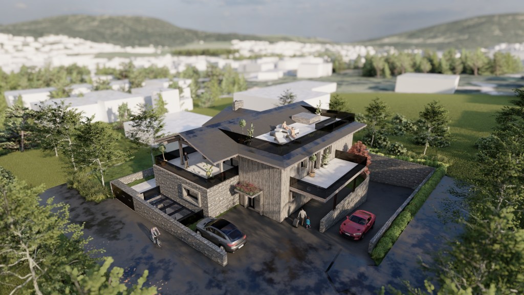 Das Einfamilienhaus mit Einliegerwohnung besteht aus zwei Bauteilen, einer mit Flachdach, der andere mit Satteldach. Das Raumprogramm wurde auf zwei ober- und zwei unterirdischen Ebenen aufgeteilt. Während im Erdgeschoss die 4 Schlafzimmer mit Bad en Suite untergebracht sind, befindet sich im Obergeschoss eine großzügige Wohnküche mit einem rustikalen Ofen als zentralen Mittelpunkt. Eine abgetrennte Zigarrenlounge befindet sich ebenfalls in dieser Ebene. Über eine einläufige Treppe und durch eine Dachluke erreicht man die rund 60m² große Dachterrasse mit Rundumblick.