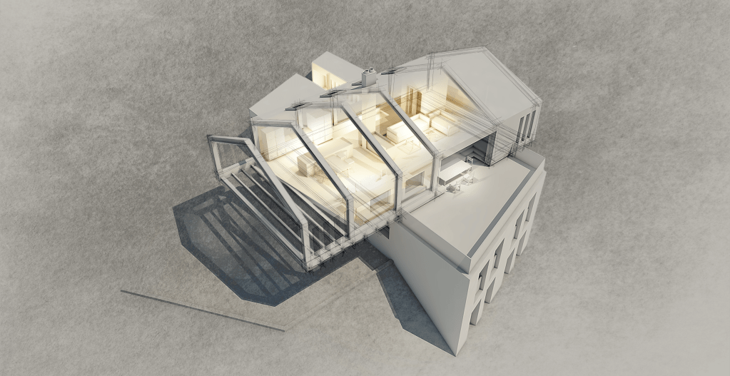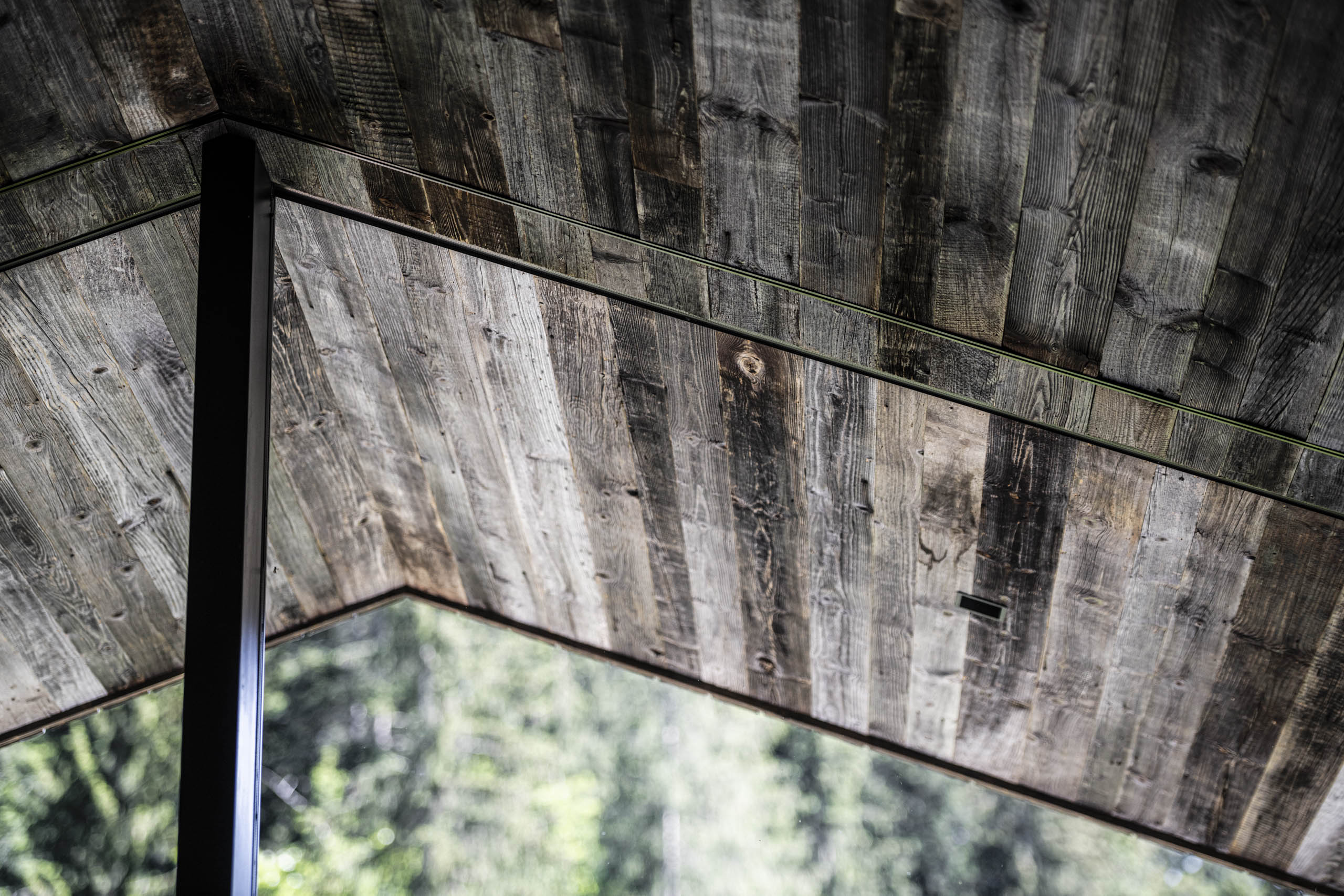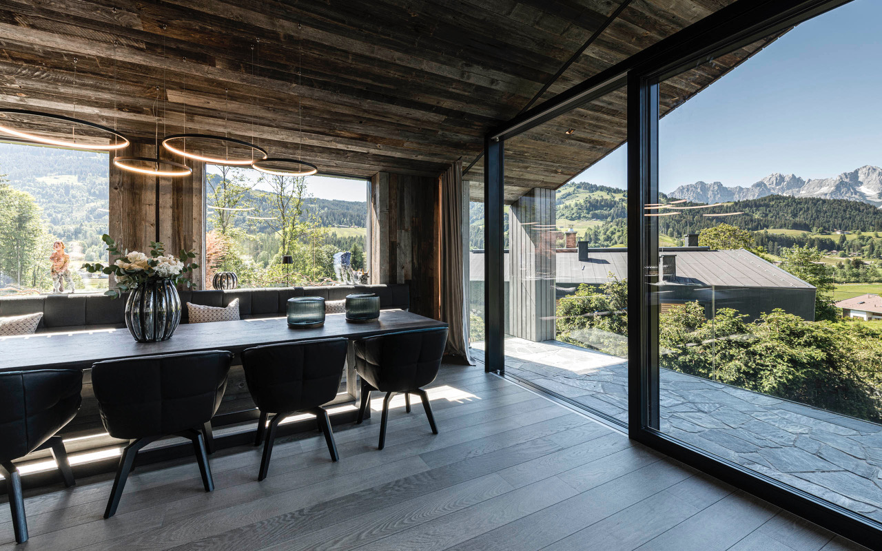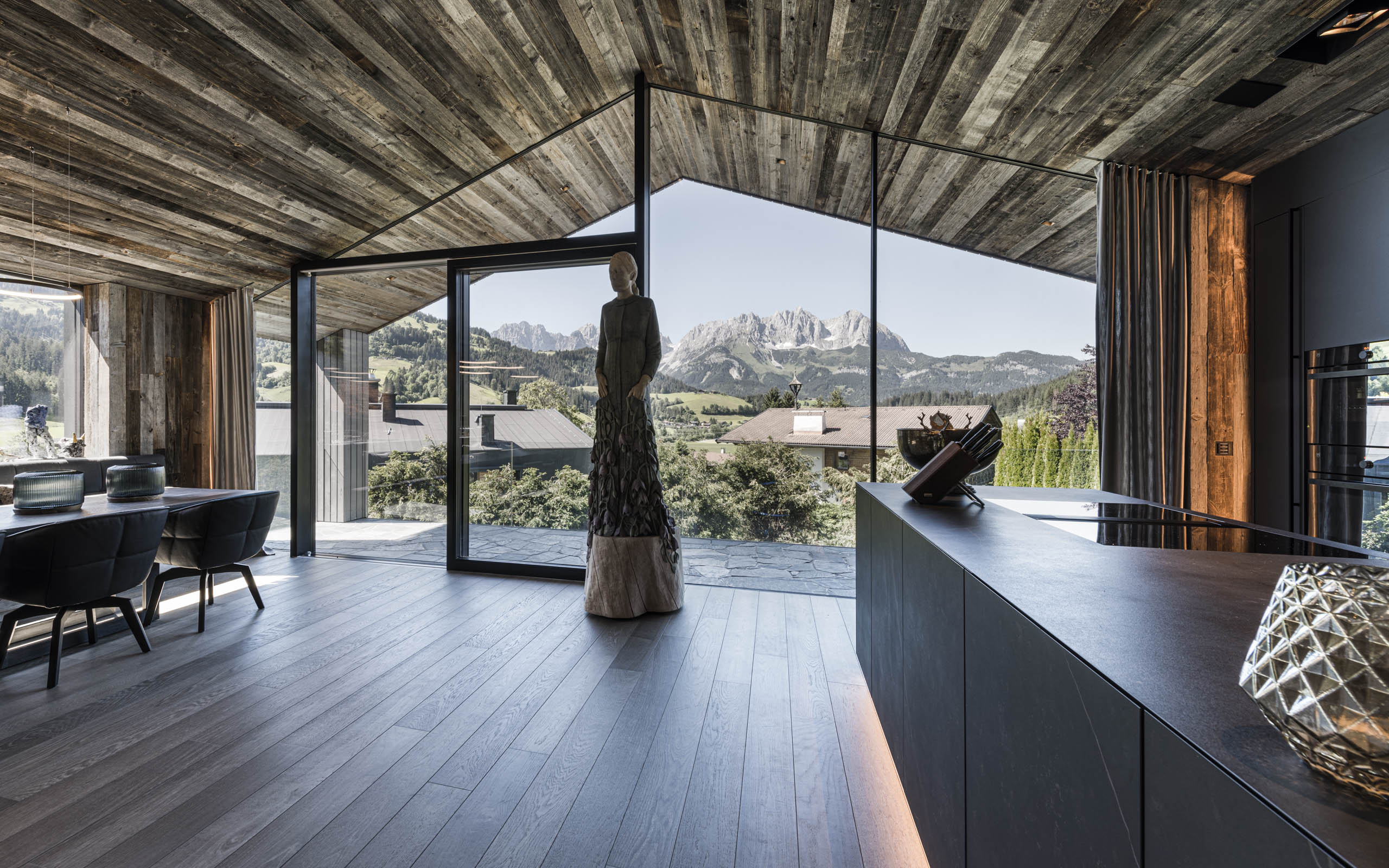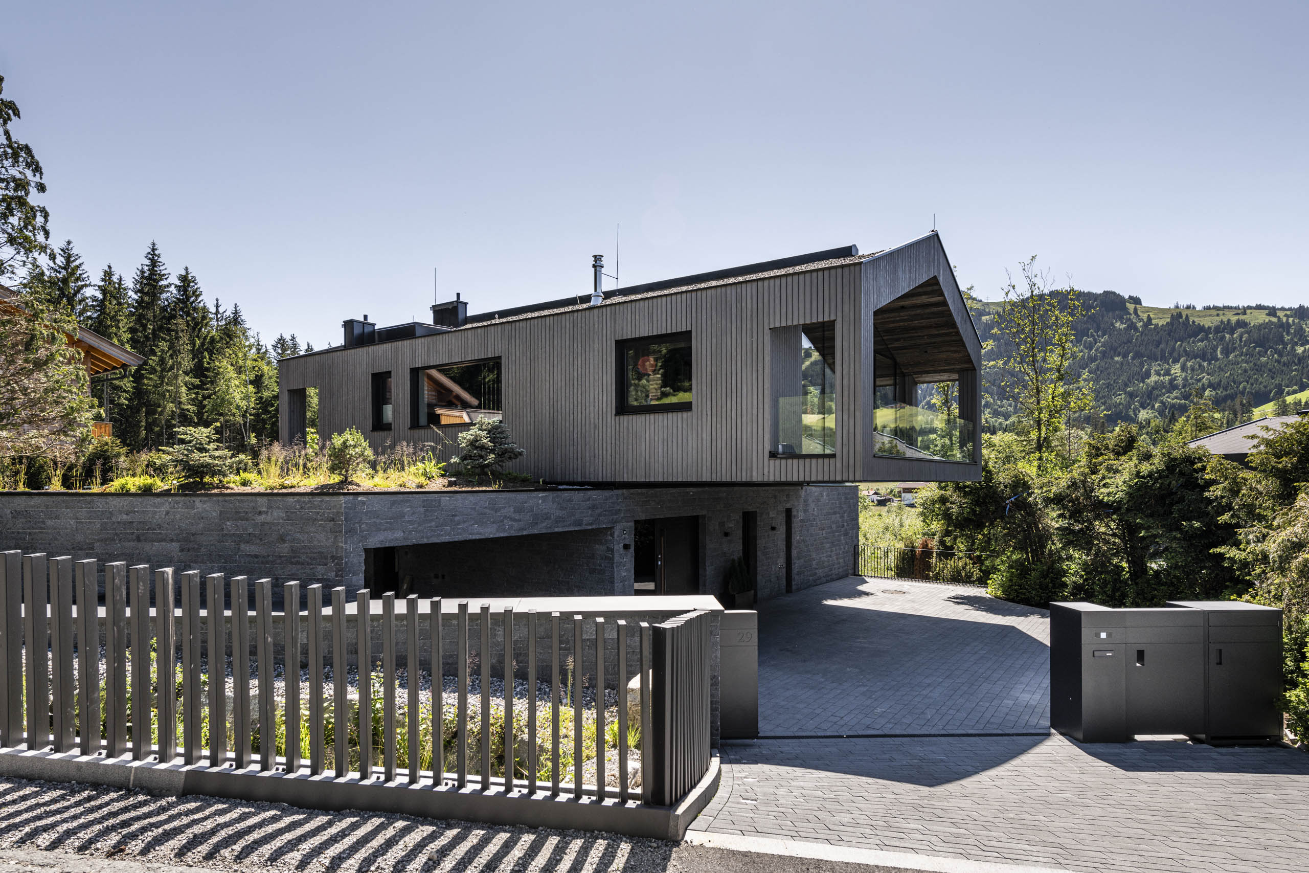 Das Highlight des Gebäudes ist das auskragende Obergeschoss. Der Bauteil mit Satteldach ist in Nord-Südrichtung auf die darunterliegenden Sockelgeschosse platziert und zentral auf die Gebirgskette des Wilden Kaiser ausgerichtet. Das Geschoss beinhaltet eine offene Wohnküche mit Balkonen an beiden Enden. Richtung Westen gibt es Zugang zur großen Dachterrasse mit überdachtem Sitzbereich.