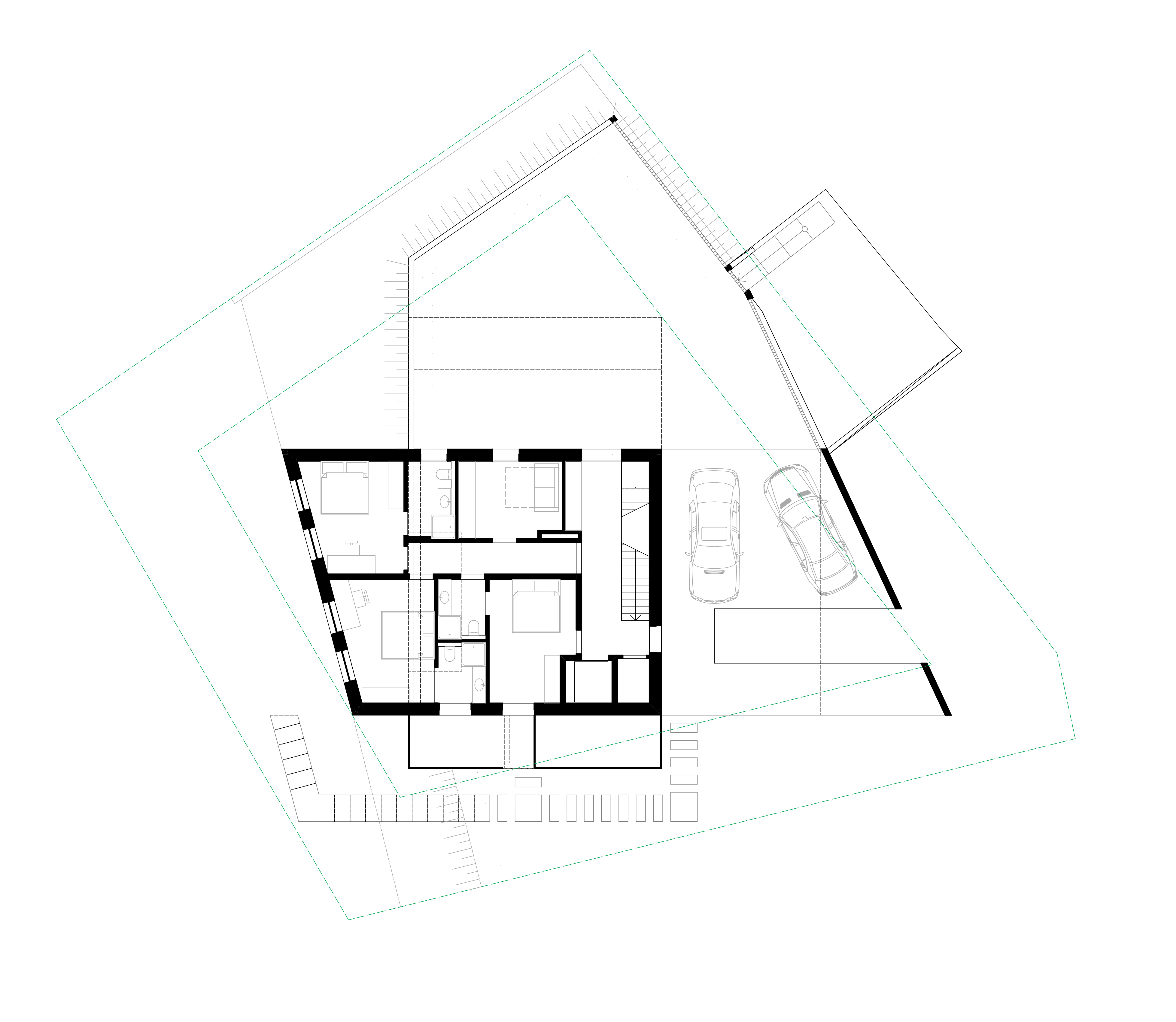 Nachdem man das Erdgeschoss betritt, befindet man sich im Vorraum, in welchem mittels Personenaufzugs und Treppe alle Geschosse erschlossen werden. Im Westen befinden sich vier Schlafzimmer mit den dazugehörigen Sanitäreinrichtungen. Richtung Osten führt eine Tür in den offenen Carport. Bäume, welche durch Öffnungen im Carportdach wachsen, sorgen für eine offene und freundliche Atmosphäre.