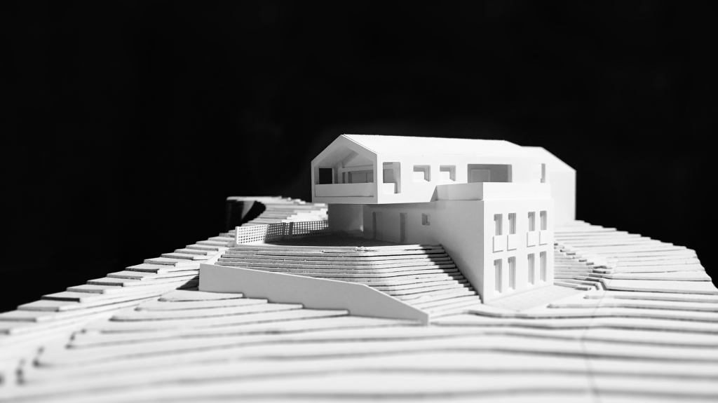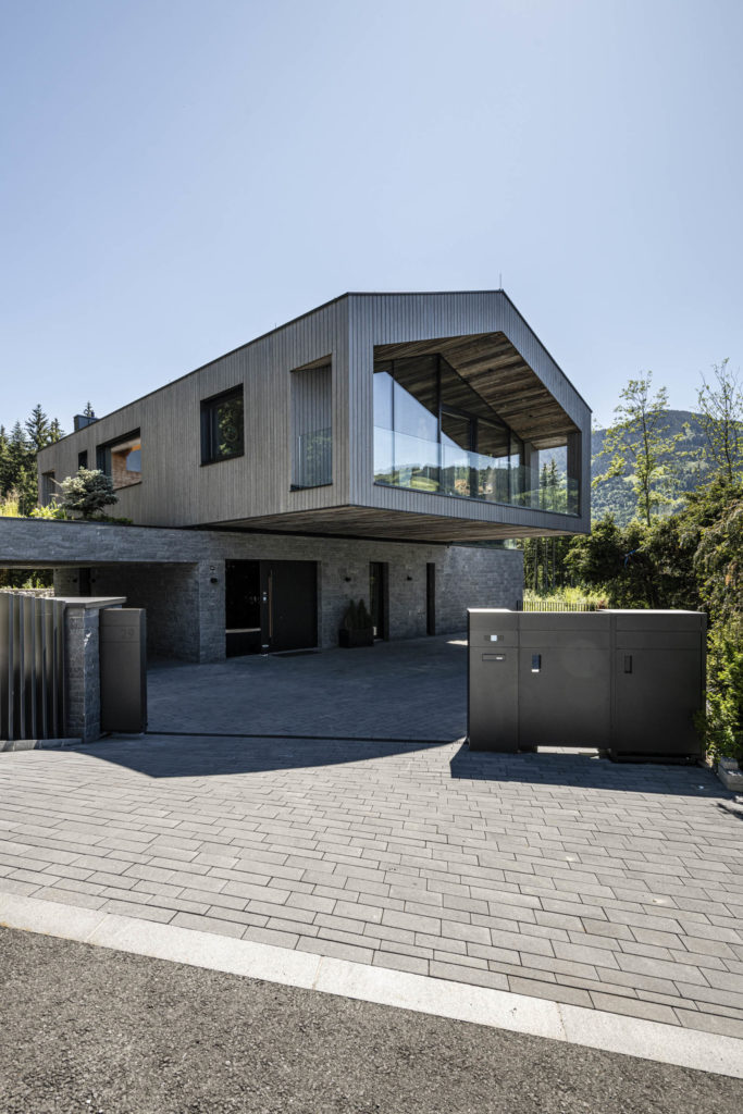 Das Gebäude besteht aus einem zweigeschossigen Sockel, sowie einem auskragenden Obergeschoss. Die beiden Bauteile sind im rechten Winkel zueinander angeordnet, wodurch die einzigartige Lage des Grundstücks perfekt genutzt werden konnte. Die Unteren Geschosse wurden mit Stein verkleidet, während der obere Baukörper mit einer vertikalen Holzschalung versehen ist.