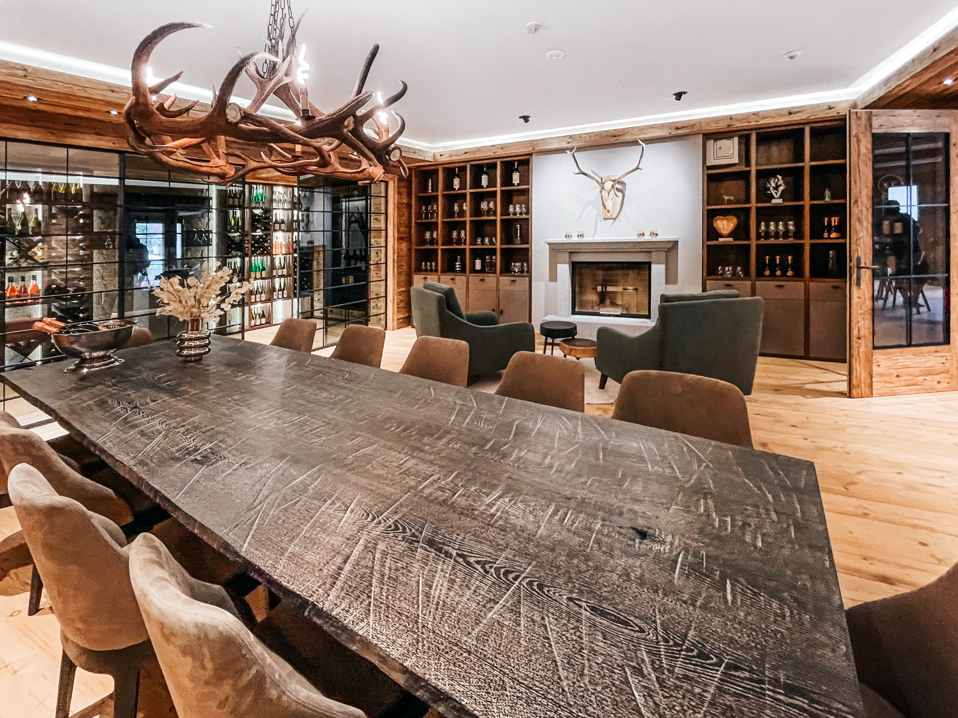 Prachtvoll ist das Obergeschoss mit Sichtgiebel aus Altholz und großen Fensterflächen – man lebt fühlbar im Einklang mit der umgebenden Natur. Die Küche ist raffiniert geplant, sodass man im nicht einsehbaren Teil auch mal ein Catering oder Personal einsetzen kann, der andere Teil geht offen zum Essplatz über. Anschließend an den Wohnbereich erinnert man mit einer entzückenden Stube an die Tradition Tirols.